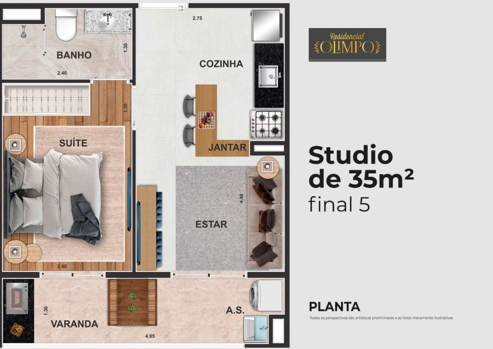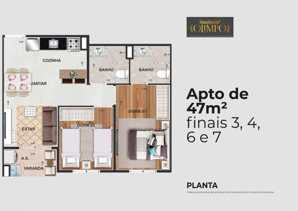 Área Total: 58,34 m²Área Privativa: 47,07 m²